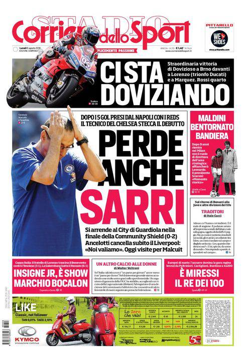 CORRIERE DELLO SPORT – L’edizione campana del quotidiano romano apre con in primo piano il ko di Maurizio Sarri nel Community Shield. L’ex allenatore del Napoli e Jorginho vengono battuti 2-0 dal Manchester City di Pep Guardiola. Decide una doppietta nelle fasi iniziali dei due tempi di Sergio Aguero. Gli azzurri intanto si preparano ad accogliere l’esterno difensivo Kevin Malcuit, oggi previste le visite mediche per l’ormai ex laterale destro del Lille. In alto, Moto GP: Dovizioso vince in Repubblica Ceca d’autorità. A lato, Paolo Maldini ritorna al Milan con un ruolo dirigenziale, 9 anni dopo. In basso, Coppa Italia: Roberto Insigne in gol nel 3-1 del Benevento sull’Imolese. Chiudono altre notizie di calcio e vari sport.