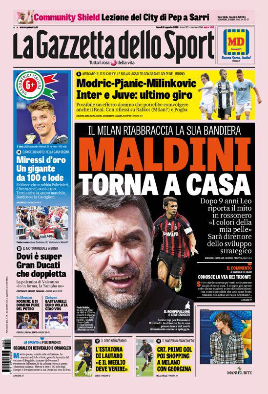 GAZZETTA DELLO SPORT – Il giornale in rosa celebra il ritorno di Paolo Maldini al Milan. Una notizia che riscuote un risalto maggiore sul quotidiano milanese. In alto poi si parla di calciomercato, quando mancano 11 giorni alla chiusura della sessione estiva. Modric, Pjanic e Milinkovic Savic possono cambiare maglia a suon di milioni. In basso, è l’estate di Lautaro Martinez e Cristiano Ronaldo. Chiudono altre news di vari sport.