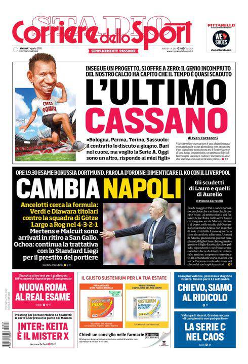 CORRIERE DELLO SPORT – La prima pagina dell’edizione campana del quotidiano romano mette in risalto l’amichevole Borussia Dortmund-Napoli che si giocherà oggi a San Gallo. Fischio di inizio alle ore 19:30, con Carlo Ancelotti che proverà nuove soluzioni per gli azzurri. Oltre a diversi cambi rispetto al test match col Liverpool di sabato scorso, vedremo con tutta probabilità un Napoli che scenderà in campo con un modulo 4-2-3-1. In alto poi c’è una intervista a Cassano, che nonostante l’età ormai tarda ha ancora voglia di mettersi in gioco in Serie A. In basso, amichevole Roma-Real Madrid per la International Champions Cup, mentre l’Inter punta forte sull’ex laziale Keita Baldé, attualmente al Monaco. Chiudono la prima pagina i guai di Chievo e Serie C.