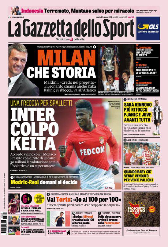 GAZZETTA DELLO SPORT – Qui si parla molto dell’accostamento Keita-Inter. L’ex attaccante della Lazio arriverebbe in nerazzurro con la formula del prestito con diritto di riscatto a 30 milioni di euro. Maldini torna al Milan e l’entusiasmo è tantissimo, la Juve invece trattiene Pjanic. C’è poi un aneddoto riguardante Cristiano Ronaldo da ragazzino. In basso, Modric vuole lasciare il Real Madrid, chiudono poi altre notizie di calcio e di vari sport.