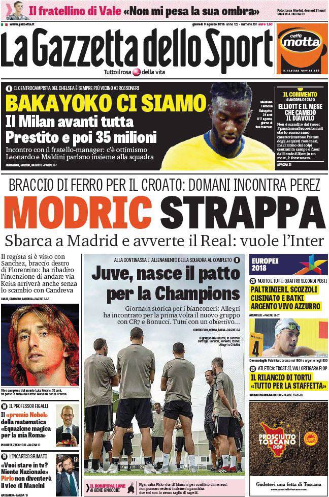 GAZZETTA DELLO SPORT – Anche l’edizione odierna de “La Gazzetta dello Sport” parla della vicenda Modric: “Modric strappa. Braccio di ferro per il croato. Domani incontra Perez. Sbarca a Madrid e avverte il Real: vuole l’Inter”. Bakayoko è ad un passo dal Milan: “Avanti tutta. Prestito e poi 35 milioni. Incontro con il fratello-manager. C’è ottimismo. Leonardo e Maldini parlano insieme alla squadra”.
