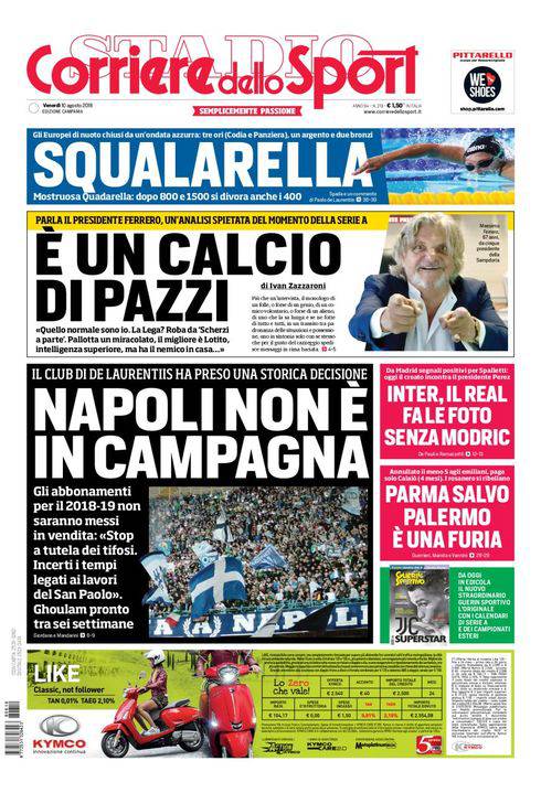 CORRIERE DELLO SPORT – L’edizione campana del quotidiano romano presenta in prima pagina una notizia clamorosa. Il Napoli ha deciso di non organizzare alcuna campagna abbonamenti per la stagione 2018/2019. Una scelta per certi versi storica, visto che mai era accaduto nella storia del club azzurro. Ma il tutto è stato condizionato dall’incertezza sui lavori al ‘San Paolo’, che stanno mettendo da tempo De Laurentiis ed il Comune l’uno contro l’altro. Alla fine la decisione di non partire con la campagna abbonamenti è avvenuta “per tutela dei tifosi”. In alto, parla Massimo Ferrero, presidente della Sampdoria: “Quello normale sono io nel pazzo calcio italiano”. Simona Quadarella ancora a medaglia agli Europei di Nuoto. A lato, Modrid non appare nelle foto del Real Madrid, il Parma conserva la categoria dopo il presunto illecito nell’ultima di B della passata stagione contro lo Spezia. E per questo protesta il Palermo.