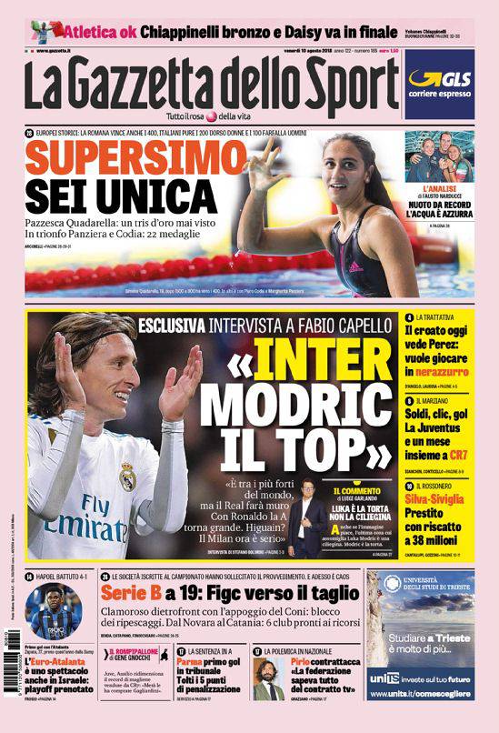 GAZZETTA DELLO SPORT – Qui è Modric a primeggiare sullo spazio principale della Rosea. L’Inter sente di poter piazzare il grande colpo, e Fabio Capello lo elogia in una intervista in esclusiva. In alto, Simona Quadarella semplicemente straordinaria con tre medaglie d’oro, uno squalo! In Serie B è caos e si profilano diversi ricorsi da parte delle società che puntano ad essere ripescate. Il Coni però pare orientato ad un torneo a 19 club. Parla Pirlo: “Non sarò il vice di Mancini, e non per mia scelta”. L’ex centrocampista è in polemica con la FIGC. Parma salvo, Atalanta ok nei preliminari di Europa League. Poi c’è il calciomercato a centropagina.