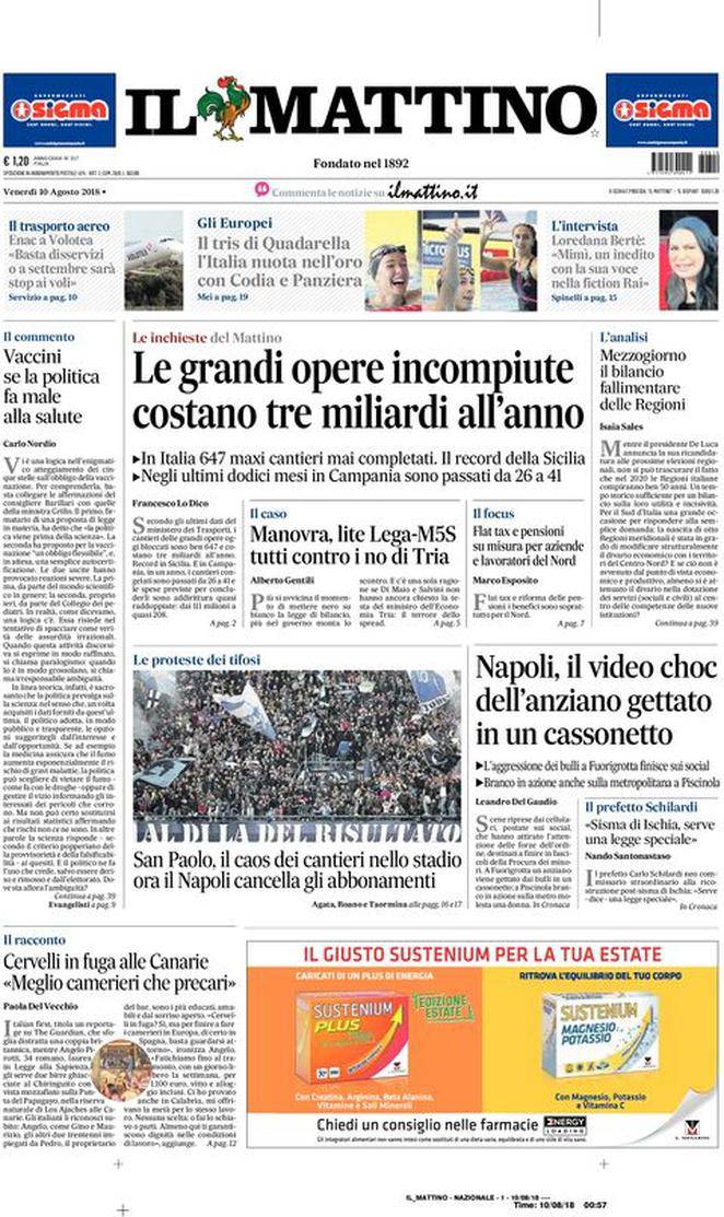 IL MATTINO – Il giornale napoletano presenta diverse notizie di politica e cronaca soprattutto italiane. E per il calcio si parla dello stop alla campagna abbonamenti del Napoli, in aperta polemica con il Comune.