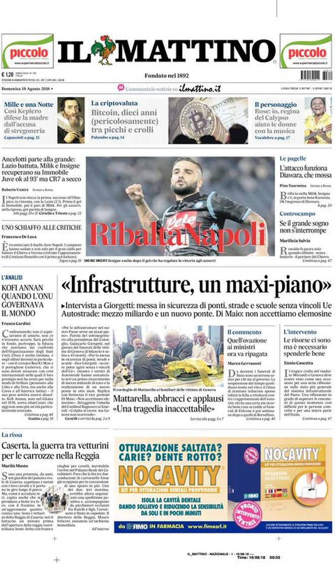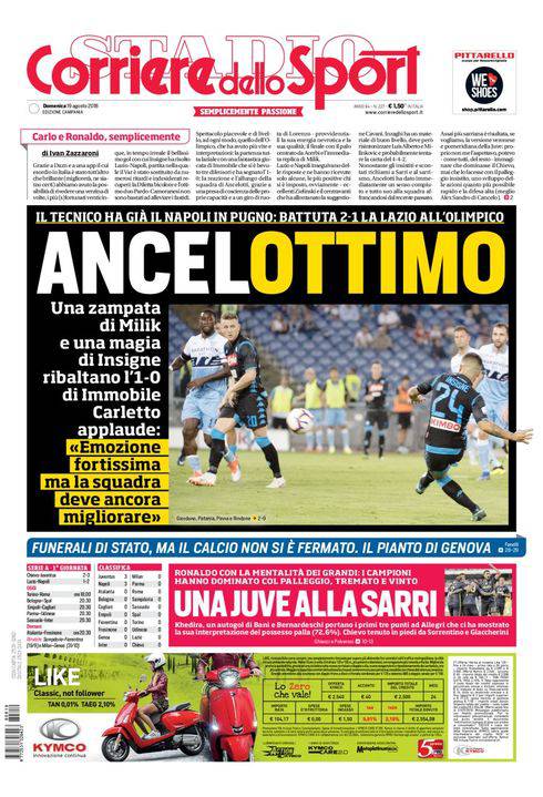 CORRIERE DELLO SPORT – La prima pagina del quotidiano romano nella sua edizione campana parla di Lazio-Napoli e dell’ottima vittoria degli azzurri di Carlo Ancelotti. Non a caso il titolo è un gioco di parole che dice tutto: “Ancelottimo”. Insigne e compagni vincono 2-1 in rimonta, esattamente come nelle due partite dello scorso campionato, nelle quali i partenopei erano andati sotto per poi dominare i biancocelesti. Segnano Immobile, Milik e poi per l’appunto Insigne, grande risposta ad una Juve affaticata e fortunata che vince solo in pieno recupero contro un combattivo Chievo. Oggi si prosegue con il resto della prima giornata, tranne che per Sampdoria-Fiorentina e Milan-Genoa, che verranno recuperate successivamente a causa del crollo del Ponte Morandi del 14 agosto.