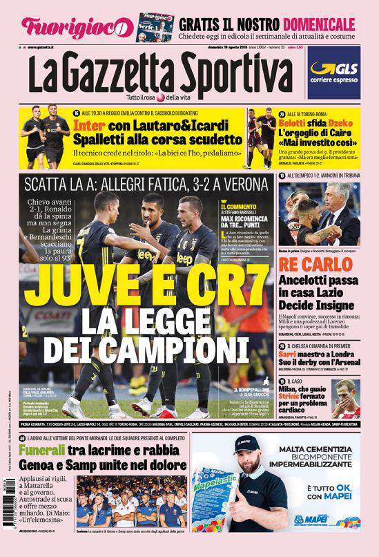 Rassegna stampa sportiva di domenica 19 agosto 2018. Le prime pagine di oggi.