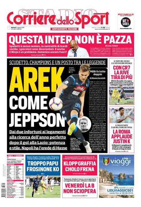 CORRIERE DELLO SPORT – L’edizione campana del quotidiano romano apre con in primo piano Arkadiusz Milik. L’attaccante polacco ha cominciato molto bene la stagione, andando in gol contro la Lazio sabato scorso. Ed anche in precampionato erano giunte buone indicazioni a livello personale da parte sua. I due brutti infortuni sono alle spalle, Milik vuole dimostrare tutta la classe di cui è dotato. In alto, Inter spenta contro il Sassuolo. Non c’entrano il campo od altre scuse, i nerazzurri hanno meritato di perdere. A lato si parla di Cristiano Ronaldo e di Justin Kluivert, figlio d’arte che ha ben impressionato la Roma. In basso, Atalanta-Frosinone 4-0 con 2 gol e 2 assist del Papu Gomez, chiudono altre notizie di calcio, con in particolare Serie B e campionati esteri.