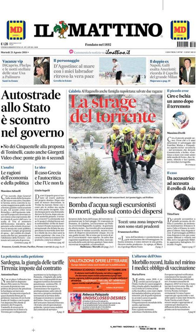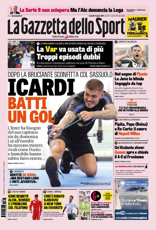 GAZZETTA DELLO SPORT – Sulla Rosea di parla della necessità da parte dell’Inter di reagire dopo l’inusitato ko della prima giornata in casa del Sassuolo. Var, va usata di più: i casi dubbi sono troppi. Pjanic-Juve, c’è il rinnovo. Si parla anche di Napoli-Milan di sabato prossimo, una partita speciale per il ‘fresco’ ex Pepe Reina. Poi si chiude con Atalanta-Frosinone 4-0. Chiudono altre notizie di calcio e vari sport.