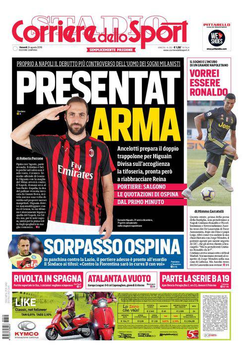 CORRIERE DELLO SPORT – La prima pagina del quotidiano romano nella sua edizione campana presenta la sfida Napoli-Milan. C’è il grande ed odiatissimo ex azzurro Gonzalo Higuain in risalto, che debutterà con la sua nuova squadra proprio al ‘San Paolo’. Di contro, Carlo Ancelotti sta preparando il piano per fermare l’argentino. In porta è ballottaggio Karnezis-Ospina, con il secondo che sta guadagnando sempre più consensi. Completano la prima pagina diverse altre notizie di calcio, tra Juve, minaccia di sciopero dei giocatori in Liga, l’inizio della controversa Serie B a 19 squadre e l’Europa League: l’Atalanta pressa ma non va oltre lo 0-0 interno contro il Copenaghen nell’ultimo preliminare prima dell’accesso alla fase a gironi.