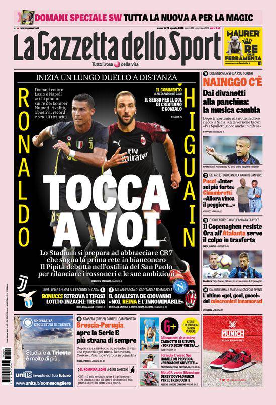 GAZZETTA DELLO SPORT – Il giornale in rosa parla delle sfide di Juventus e Milan rispettivamente contro Lazio e Napoli. In prima ci sono Cristiano Ronaldo e Gonzalo Higuain, e la Gazzetta tifa per le squadre con le strisce. In basso, Bonucci fa pace con i tifosi bianconeri, Lotito fa pace con Simone Inzaghi dopo la burrascosa chiacchierata intercettata nei giorni scorsi, mentre a lato si parla di Inter e Torino, che si sfideranno domenica, e dell’Europa League con il pari senza reti dell’Atalanta. Per passare il turno servirà una vittoria in Danimarca. Chiudono la prima pagina altre notizie di calcio e vari sport.