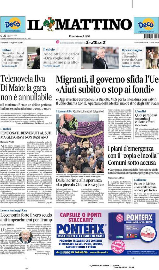 IL MATTINO – Il quotidiano napoletano presenta diversi aggiornamenti di politica e cronaca, sia italiane che estere. Per quanto riguarda Napoli-Milan, Ancelotti parla alla vigilia e dichiara tutti i propri propositi di vincere lo scudetto.