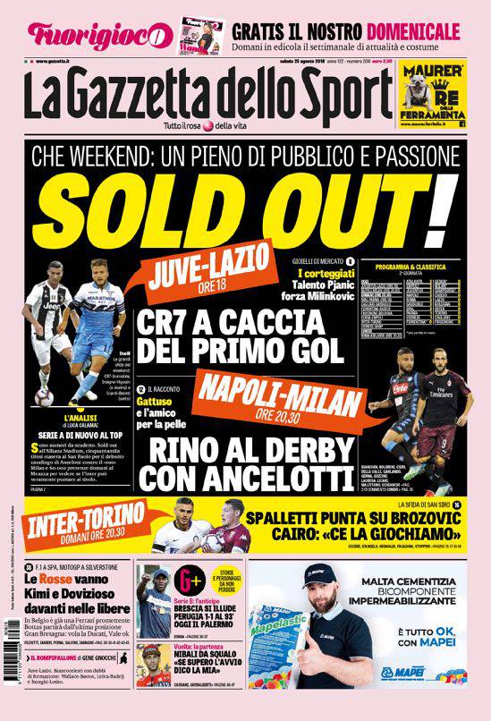 Gazzetta dello Sport – La Rosea esalta i due big match della seconda giornata e si entusiasma per il pieno di pubblico previsto nei rispettivi stadi. A centro pagina, in primo piano, la doppia sfida Juve-Lazio e Napoli-Milan. Cristiano Ronaldo è a caccia del suo primo gol in Italia, e proverà a sbloccarsi contro i biancocelesti, intanto Gattuso incontra il suo ‘amico per la pelle’, Ancelotti, tanto che il match è considerato un ‘derby’. Domani, poi, sarà la volta di Inter-Torino, con Spalletti pronto a puntare su Brozovic e Cairo che afferma deciso: “Ce la giochiamo”.