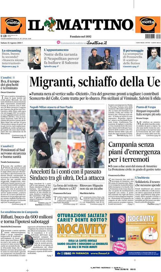 Il Mattino – Il quotidiano apre a centro pagina con il tema sportivo di giornata, l’incontro tra azzurri e rossoneri al San Paolo. “Ancelotti fa i conti col passato” è il titolo, che prosegue citando la polemica infinita nella quale sono coinvolti sindaco della città e presidente del Napoli: “De Magistris tra gli ultrà, DeLa attacca”. Per il resto il tema è la politica o l’attualità.