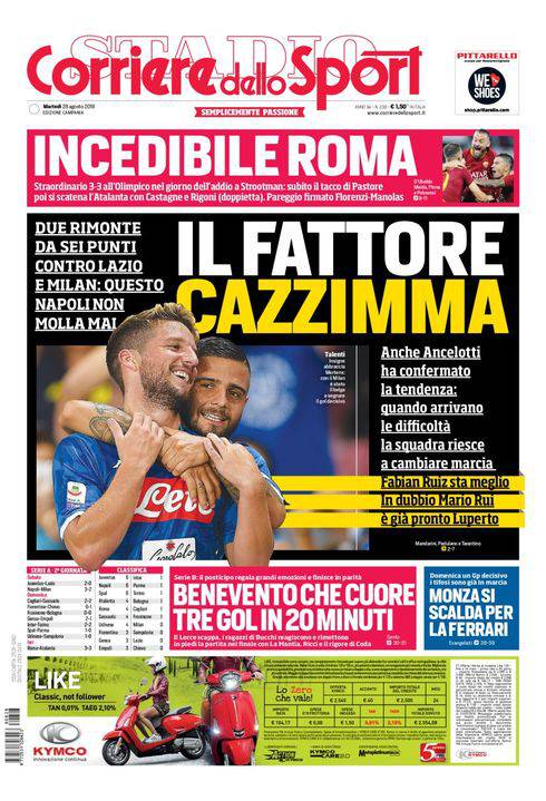 CORRIERE DELLO SPORT – La prima pagina dell’edizione campana del CorSport mette in risalto il Napoli e la sua capacità di scalare le avversità. Le due vittorie in campionato sono avvenute in seguito ad altrettante rimonte di personalità e carattere. E contro avversari di primo piano come Lazio e Milan. Anche Ancelotti conferma questo trend: “Quando siamo in difficoltà, cresciamo e cambiamo marcia”. Per la trasferta in casa della Sampdoria è già ballottaggio Mario Rui-Luperto, migliorano le condizioni fisiche di Fabian Ruiz. In Serie B gran rimonta anche del Benevento: sotto in casa col Lecce per 3-0 al 69′, i sanniti riescono a fare 3-3. Chiude la Formula 1 con il prossimo Gran Premio d’Italia a Monza.