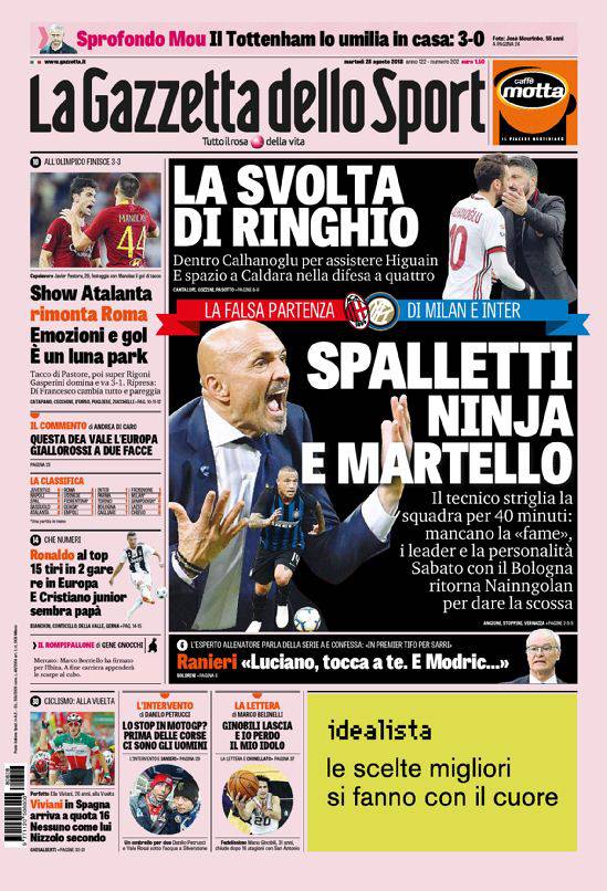 GAZZETTA DELLO SPORT – La Rosea analizza i problemi in casa di Milan ed Inter. C’è stata una falsa partenza per entrambe le compagini di Milano. I rossoneri sembrano però poterne uscire più facilmente, dopo aver fatto comunque una buona impressione a Napoli. Spalletti invece striglia i nerazzurri, accusando i suoi giocatori di essere poco cattivi. A Bologna ci sarà l’esordio in campionato di Nainggolan. A lato, l’Atalanta sfiora il colpaccio con tante riserve in casa della Roma, ma dal 3-1 orobico alla fine è 3-3. Chiudono la prima pagina della Gazzetta altre notizie di calcio e vari sport.