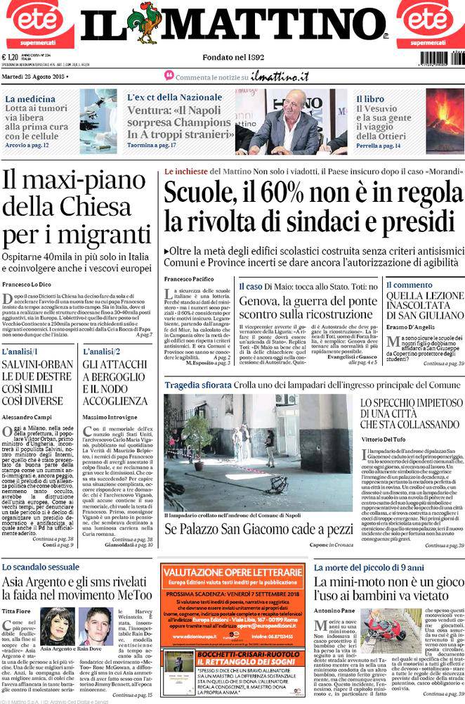 IL MATTINO – Il quotidiano di Napoli parla di notizie dall’Italia e dal mondo, di cronaca e di politica soprattutto. Per quanto riguarda lo sport, c’è una intervista all’ex commissario tecnico, Gian Piero Ventura, che parla degli azzurri di Carlo Ancelotti come della prossima rivelazione in Champions League.