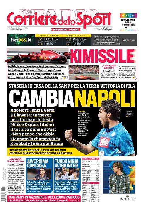 CORRIERE DELLO SPORT – La prima pagina del quotidiano romano nella sua edizione campana odierna presenta nello spazio principale il Napoli. Gli azzurri si presentano a Marassi al cospetto della Sampdoria con due importanti novità di formazione. Al posto di Hamsik e Callejon scalpitano infatti Diawara e Verdi. Ed Ancelotti punzecchia il suo ex PSG: “Non avrà stappato lo champagne sapendo di aver trovato il Napoli in Champions League”. In alto si parla di Ferrari, con la pole position di Kimi Raikkonen nel GP d’Italia di oggi. In basso, l’Inter batte 3-0 il Bologna con tre gol nell’ultimo quarto di partita, buonissimo impatto di Nainggolan alla sua prima partita ufficiale in nerazzurro. Vince anche la Juve, 2-1 contro un combattivo Parma. Chiudono la prima pagina altre notizie di calcio.