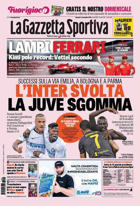 GAZZETTA DELLO SPORT – Emilia-Romagna terra felice per Inter e Juventus, che battono rispettivamente Bologna e Parma negli anticipi della 3/a giornata di campionato. Oggi tocca al Napoli in casa della Sampdoria, con le già citate novità di formazione. In alto c’è la Formula 1, dietro a Raikkonen ci sarà l’altra Ferrari di Vettel. In basso chiudono la prima pagina della Gazzetta varie news di calcio.