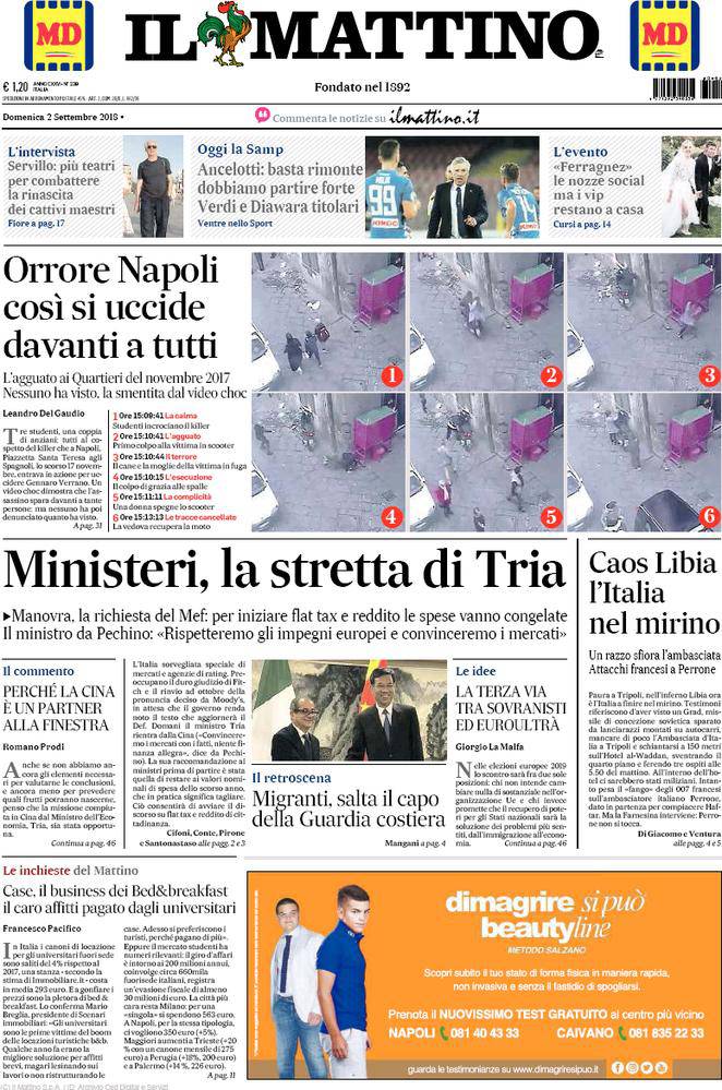 IL MATTINO – Si parla di notizie di cronaca e di politica sul quotidiano napoletano. E c’è spazio anche per Sampdoria-Napoli di questa sera, con le novità di formazione già note ed Ancelotti che chiede una vittoria senza rimonte.