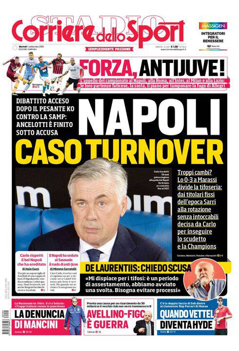 CORRIERE DELLO SPORT – La prima pagina del quotidiano romano nella sua edizione campana presenta Carlo Ancelotti in posa pensierosa. La sconfitta nettissima per 3-0 in casa della Sampdoria deve far riflettere. Il CorSport punta il dito contro il turnover, nonostante siano stati solo due i cambi di formazione. E pensare che comunque era proprio il fatto di utilizzare solo i titolari che spesso è stato imputato a Maurizio Sarri. E parla De Laurentiis: “Mi dispiace aver dato questo dispiacere ai tifosi. Siamo ancora in asestamento e serve tempo, ma abbiamo dato il via ad una svolta, per cui i processi vanno evitati”. Parla anche Roberto Mancini: il commissario tecnico si lamenta: “Non ho mai visto così pochi italiani in campo”. L’Avellino, escluso per inadempienze dalla Serie B, fa causa alla FIGC: chiesti 30 milioni di euro se non sarà riammesso al campionato.