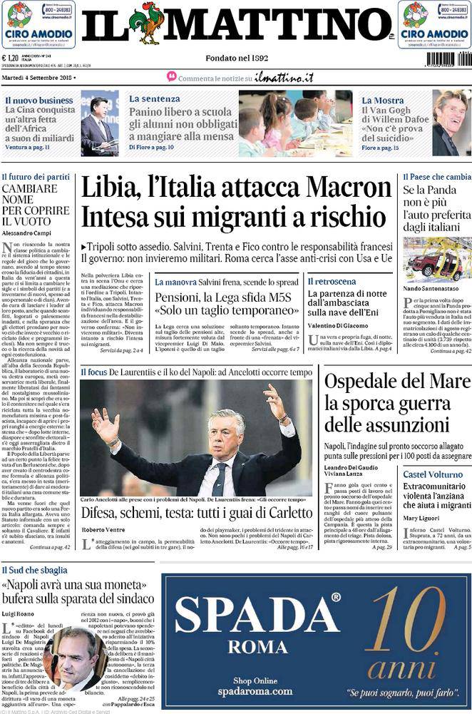 IL MATTINO – Sul quotidiano napoletano si parla di notizie di cronaca italiane ed estere. Per quanto riguarda il calcio ci sono le parole di De Laurentiis su Ancelotti: “Ci vuole del tempo”.