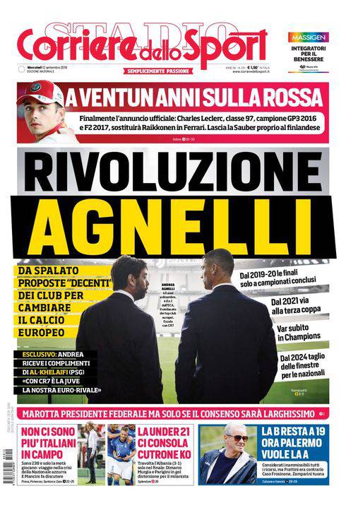 Corriere dello Sport – In primo piano Agnelli, presidente della Juventus, che, insieme ad Al-Khelaifi (presidente del PSG), avrebbe delle richieste per riformare il calcio europeo. Quattro i punti fondamentali: dal 2019 finali solo a campionati conclusi, dal 2021 nuova coppa, introduzione del VAR, taglio delle finestre nazionali dal 2024. Mentre l’Italia dei grandi delude ancora una volta, c’è un Under 21 che ‘ci consola’ travolgendo l’Albania.