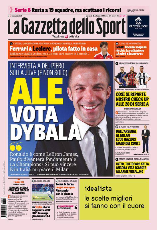 Gazzetta dello Sport – A centro pagina Alessandro Del Piero, che proprio alla Rosea ha lasciato un’intervista esclusiva. Il campione del mondo ha parlato di Ronaldo, Dybala e Champions. Per il Milan, dall’Arsenal, arriva il ‘mago dei conti’ Gazidis. Per l’Inter, invece, è allarme Vrsaljko. Per quanto riguarda la nazionale italiana l’appello a Mancini: scelga come far giocare la squadra.