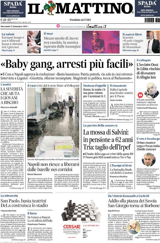 Il Mattino – Sul quotidiano campano, come di consueto, c’è tanto spazio a cronaca e fatti d’attualità e politica, e meno per lo sport. Un piccolo opuscolo è però dedicato al Napoli e all’Italia. L’appello è, nel primo caso, a De Laurentiis: faccia uno stadio nuovo per mettere fine al teatrino del San Paolo, è, in sintesi, il discorso sviluppato. Da Ventura a Mancini non sembra essere cambiato molto per la nazionale, è ancora evidente una crisi del nostro calcio.