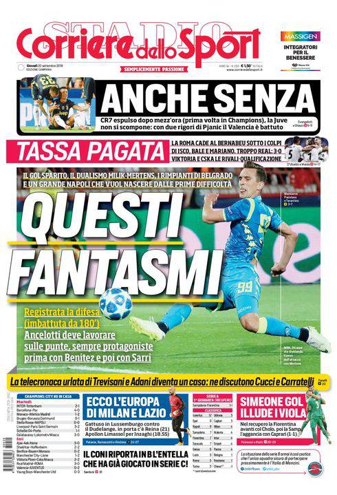 CORRIERE DELLO SPORT – L’apertura del quotidiano romano nella sua edizione campana parla dei problemi del Napoli. Si fatica a fare gol, con una sola rete siglata nelle ultime tre partite. E la partita con la Stella Rossa ha lasciato delle difficoltà. Ma la squadra ha tanta voglia di emergere e di lasciarsi dietro le difficoltà. C’è di buono che da 180′ la rete azzurra è rimasta inviolata. Champions League, la Juve vince con due rigori a Valencia e con Cristiano Ronaldo espulso dopo mezzora. Perde nettamente invece la Roma per 3-0. In basso, c’è l’Europa League, tocca a Milan e Lazio. Serie A, 1-1 in Sampdoria-Fiorentina per il recupero della 1/a giornata. Serie B, caos a non finire: ripescata l’Entella che ha già giocato in Serie C.