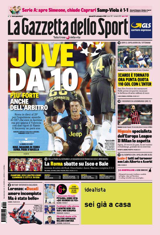 GAZZETTA DELLO SPORT – Il giornale in rosa esalta la Juventus: “Più forte anche dell’arbitro”. Si parla anche di Inter, con il primo gol in Champions in nerazzurro al debutto, e di Milan e Lazio che giocano oggi in Europa League. Male la Roma, sconfitta nettamente dal Real Madrid. Chiusura con Moto GP ed un approfondimento sulla SPAL.