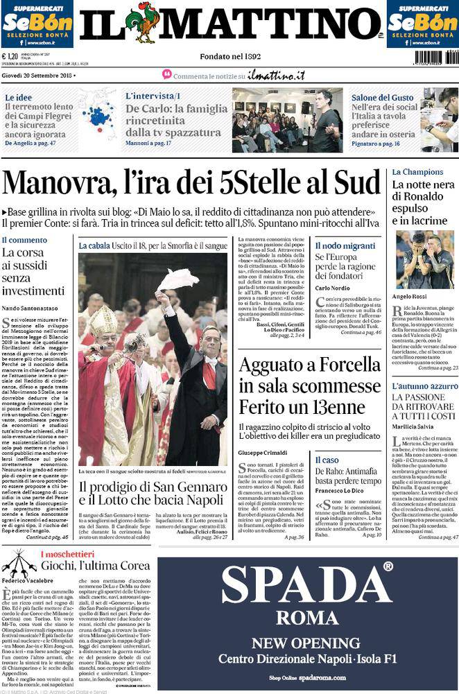 IL MATTINO – Tante notizia di cronaca e politica italiane. Si parla di Juventus per quanto riguarda il calcio, con l’espulsione di Cristiano Ronaldo contro il Valencia che tiene banco.