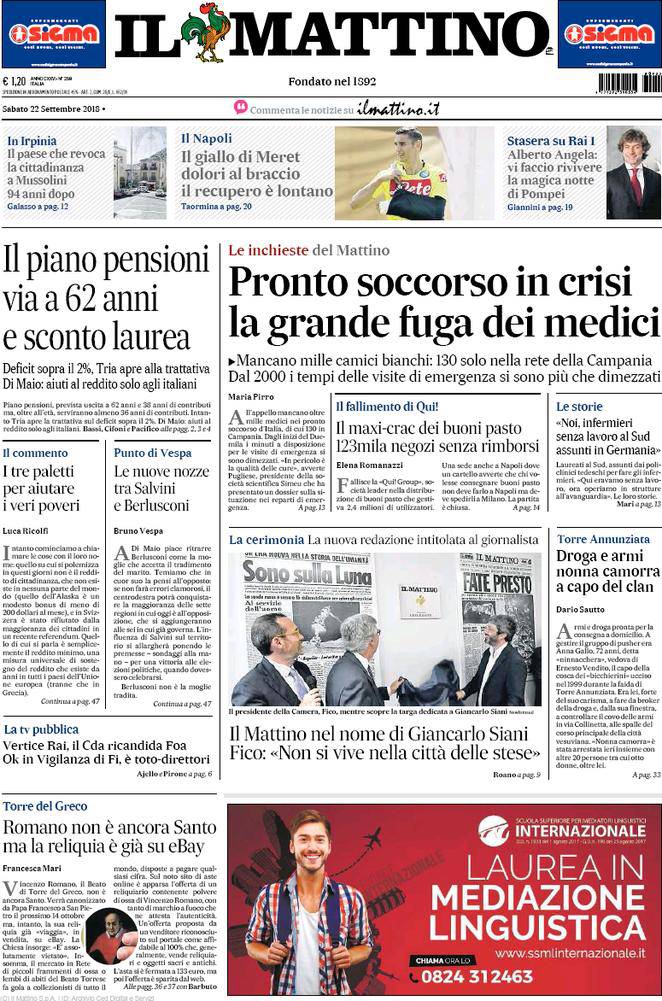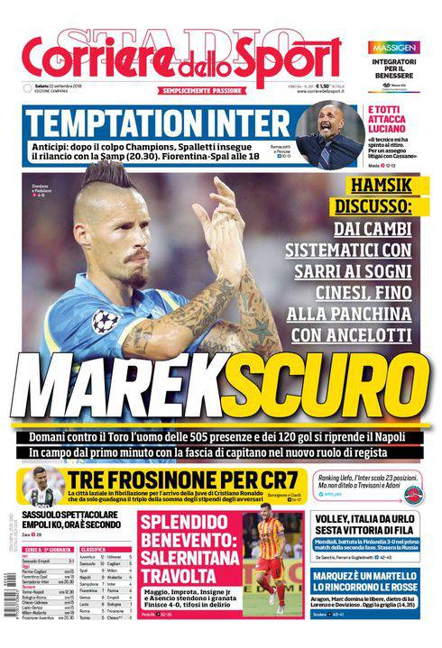 CORRIERE DELLO SPORT – L’apertura dell’edizione campana del quotidiano romano è dedicata a Marek Hamsik. Il capitano del Napoli sta avendo delle grosse difficoltà ad adattarsi al ruolo di regista. Dopo i tanti cambi sistematici che aveva dovuto subire nella scorsa stagione con Sarri, adesso il rischio è che possa addirittura uscire dal novero dei titolari. E qualcuno ha pure parlato di possibile cessione nel calciomercato invernale di gennaio. Intanto però con il Torino dovrebbe essere titolare. Hamsik insegue anche il record dei pù presenti di sempre in azzurro, il primatista Bruscolotti è lontano solo 7 partite. Il richiamo dalla Cina può risvegliarsi. Serie A: oggi due anticipi: Fiorentina-SPAL e Sampdoria-Inter, intanto Luciano Spalletti riceve la stoccata di Totti che nella sua autobiografia scrive: “Lui è stato quello che più di tutti spingeva per farmi ritirare”. Il tecnico: “Non replico, c’è una partita importante. Leggerò il libro e poi faremo alcune valutazioni”. Sassuolo-Empoli 3-1 nel primo anticipo di ieri, si chiude la prima pagina col derby Benevento-Salernitana 4-0 e con altre notizie di calcio ed altri sport.