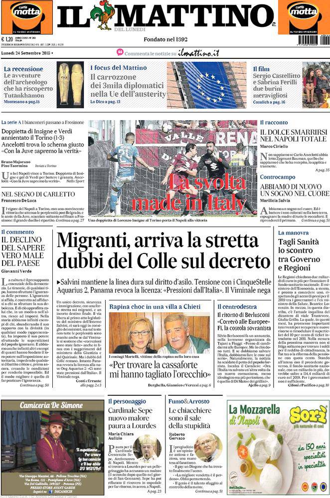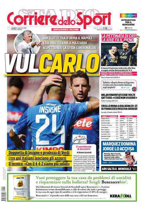 CORRIERE DELLO SPORT – Il quotidiano romano, nella sua edizione campana, esalta il Napoli e soprattutto Carlo Ancelotti. Il successo di ieri per 3-1 in casa del Torino è soprattutto merito dell’allenatore azzurro, come ammesso da Walter Mazzarri in conferenza stampa post-partita. “Ci ha dato una lezione di tattica”. In Torino-Napoli la vittoria partenopea è netta, con un gol incassato solamente su rigore, un buonissimo biglietto da visita ad una Juve che ancora una volta vince nel finale soffrendo. Lo stesso Ancelotti dice: “Con il 4-4-2 siamo più solidi”, e c’è gloria anche per Verdi, al suo primo gol in azzurro. Milan rimontato due volte dall’Atalanta, la delusione di Gattuso. Poi c’è il crollo della Roma contro un Bologna che vince 2-0 e che mai prima di ieri era riuscito a segnare in campionato. Chiude la prima pagina la MotoGP, con un duello verbale tra gli spagnoli Marquez e Lorenzo.