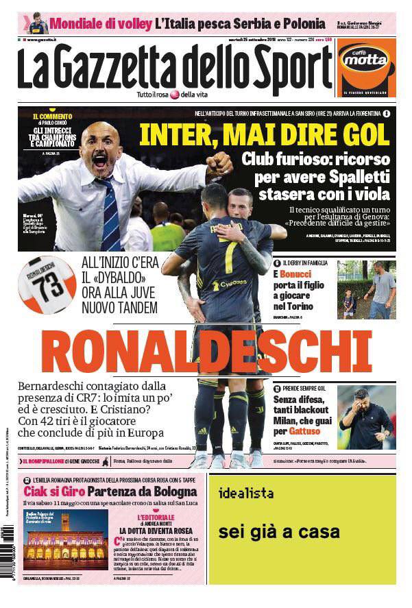 GAZZETTA DELLO SPORT – L’edizione odierna della rosea, invece, esalta l’intesa perfetta tra Cr7 e Bernardeschi: “All’inizio c’era il ‘Dybaldo’, ora alla Juve nuovo tandem. Ronaldeschi, Bernardeschi contagiato dalla presenza di Cr7: lo imita un po’ ed è cresciuto. E Cristiano? Con 42 tiri è il giocatore che conclude di più in Europa”. L’Inter affronterà a San Siro la Fiorentina: “Inter, mai dire gol. Club furioso, ricorso per avere Spalletti stasera contro i viola. Il tecnico squalificato un turno per l’esultanza di Genova. Precedente difficile da gestire”.