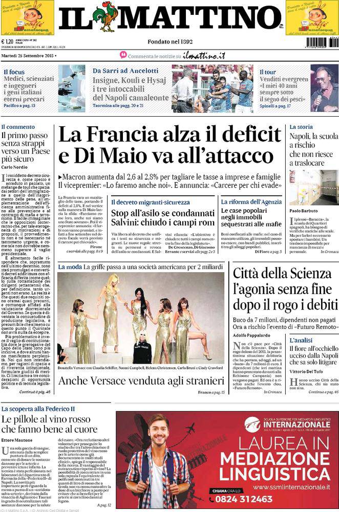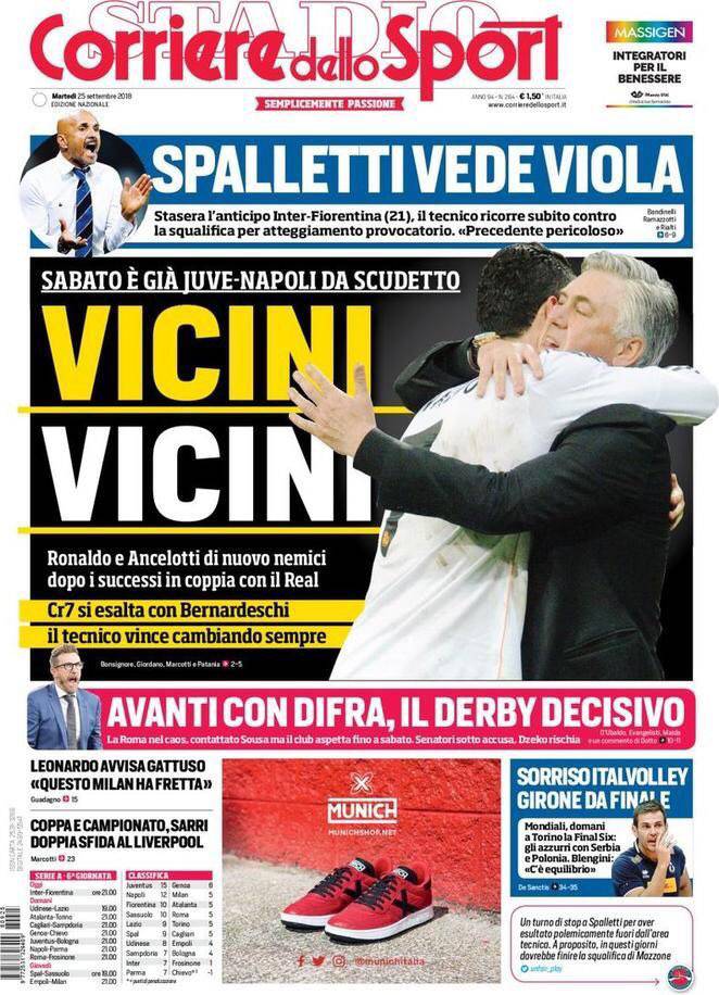 CORRIERE DELLO SPORT – L’edizione odierna del quotidiano romano si è proiettata già alla sfida di campionato tra Juventus e Napoli: “Sabato è già Juve-Napoli da scudetto. Vicini vicini, Ronaldo e Ancelotti di nuovo nemici dopo i successi in coppia con il Real. Cr7 si esalta con Bernardeschi, il tecnico vince cambiando spesso”. Questa sera, invece, l’Inter sfiderà la Fiorentina per la sesta giornata di Serie A: “Spalletti vede viola. Stasera l’anticipo Inter-Fiorentina. Il tecnico ricorre subito contro la squalifica per atteggiamento provocatorio”. La Roma dovrà tornare subito alla vittoria: “Avanti con DiFra, il derby decisivo. La Roma nel caos, contattato Sousa ma il club aspetta fino a sabato. Senatori sotto accusa, Dzeko rischia”. Sabato prossimo ci sarà il derby di Roma con i giallorossi che avrà una delle ultime possibilità di salvare la stagione, iniziata in maniera negativa con soltanto 4 punti dopo 5 giornate di campionato.