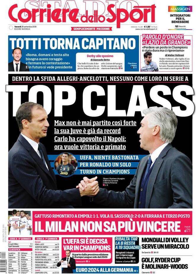 CORRIERE DELLO SPORT – La prima pagina del quotidiano romano è dedicata interamente alla supersfida in programma domani alle 18 all’Allianz tra Juventus e Napoli: “Top class. Max non è partito mai così forte, la sua Juve è già da record. Carlo ha capovolto il Napoli: ora vuole primato e vittoria. La sfida Allegri-Ancelotti, nessuno come loro in Serie A”. Dopo la vittoria dello scorso anno grazie all’incornata vincente di Koulibaly al 90′, gli azzurri proveranno a ripetere l’impresa storica dello scorso anno. Ancora un pareggio per il Milan: “Il Milan non sa più vincere. Gattuso rimontato a Empoli: 1-1. Vola il Sassuolo: 2-0 a Ferrara e terzo posto”. Ieri al Colosseo presentazione del libro di Francesco Totti: “Torna capitano. ‘Roma, a testa alta bisogna avere coraggio e fermare la contestazione’. E in futuro si vede presidente”.
