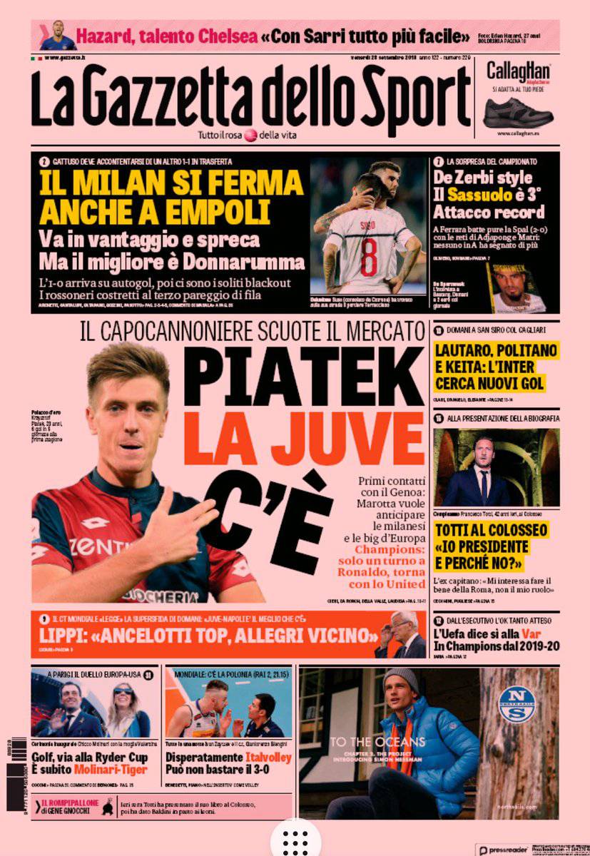 GAZZETTA DELLO SPORT – L’edizione odierna del quotidiano rosa, invece, ha dedicato la prima pagina al capocannoniere della Serie A Piatek: “La Juve c’è. Primi contatti con il Genoa. Marotta vuole anticipare le milanesi e le big d’Europa. Champions: solo un turno a Ronaldo, torna con lo United”. Marcello Lippi, poi, in un’intervista esclusiva a “La Gazzetta dello Sport” ha messo a confronto il lavoro di Ancelotti con quello di Allegri: “Ancelotti top, Allegri vicino”.