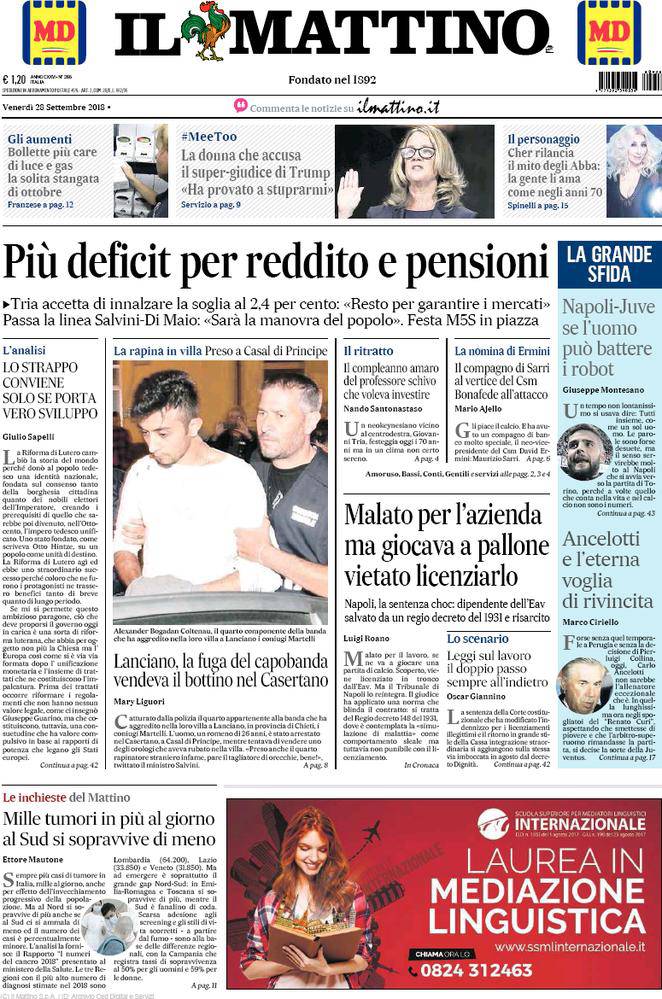 Rassegna stampa sportiva di venerdì 28 settembre. Le prime pagine di Corriere dello Sport, Gazzetta ed Il Mattino. Domani alle 18 Juventus-Napoli.