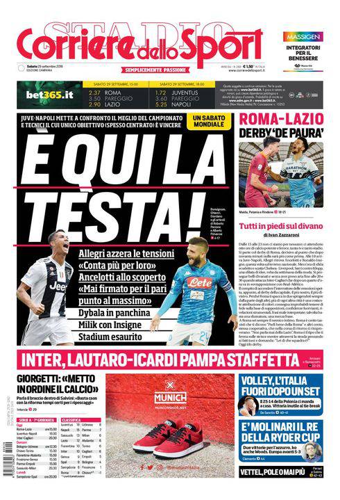 CORRIERE DELLO SPORT – È il grande giorno di Juventus-Napoli. L’apertura campana del quotidiano romano apre con un titolo emblematico. “È qui la testa”, a sottolineare l’importanza dei 3 punti in palio. Un successo dell’una o dell’altra squadra potrà cambiare il destino del campionato almeno nel breve periodo, essendoci comunque tanti altri punti in palio. La gara di Torino sarà preceduta dal derby Roma-Lazio. Poi stasera chiuderà il programma degli anticipi del sabato per il 7° turno di campionato Inter-Cagliari. Chiudono la prima pagina altre notizie di calcio ed altri sport.