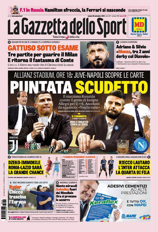 GAZZETTA DELLO SPORT – La Rosea dà parimenti importanza a Juventus-Napoli parlando di “Puntata scudetto”. E presenta Cristiano Ronaldo e Lorenzo Insigne in versione pokeristi. Si parla anche di Roma-Lazio ed Inter-Cagliari, oltre che del Milan. E Berlusconi e Galliani tornano in gioco acquistando il 100% del Monza. “Tra due anni sarà derby col Milan”, promettono i due. Chiudono altre notizie di vari sport.