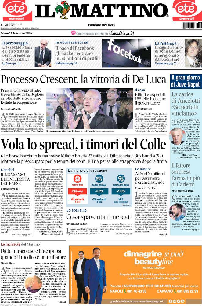 Rassegna stampa sportiva di sabato 29 settembre 2018. Le prime pagine.