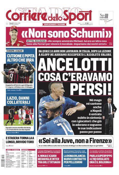 CORRIERE DELLO SPORT – La prima pagina del quotidiano romano esalta il ritorno in Italia di Carlo Ancelotti dopo la splendida vittoria contro il Liverpool: “Cosa c’eravamo persi! Da quasi 10 anni non lavorava in Italia. Dopo la lezione di Klopp ne abbiamo riscoperto l’assoluto valore. Né mago né santone anche a Napoli è entrato subito in sintonia con i giocatori: che già lo adorano e seguono le sue indicazioni passo dopo passo”. Il Milan vince anche in Europa dopo il successo in campionato: “Cutrone e Pipita. Altro che Ibra. Doppietta di Patrick e gol di Higuain: 3-1 ai greci, di Zlatan non c’è bisogno”. Cade, invece, ancora una volta la Lazio dopo la sconfitta nel derby di Roma: “Lazio, danni collaterali. Squadra ancora stordita dal derby. 1-4 a Francoforte con due espulsi”. Diffuso, infine, un video di Allegri in cui riprende Bernardeschi: “Sei alla Juve, non a Firenze”.