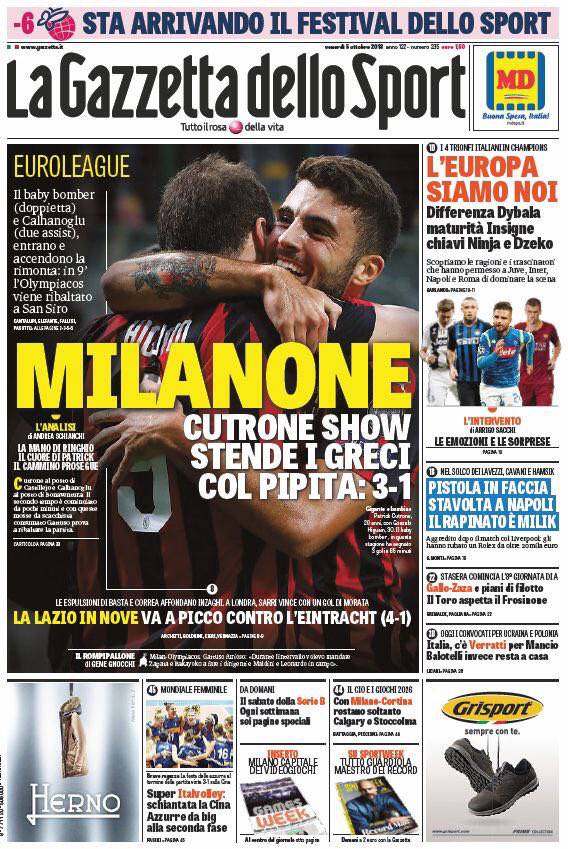 GAZZETTA DELLO SPORT – L’edizione odierna de “La Gazzetta dello Sport” ha esaltato la prova del Milan: “Cutrone show stende i greci col Pipita. Il baby bomber (doppietta) e Calhanoglu (due assist) entrano e accendono la rimonta: in 9′ l’Olympiacos viene ribaltato a San Siro”. Bene le italiane in Europa: “L’Europa siamo noi. Differenza Dybala, maturità Insigne. Chiavi Ninja e Dzeko. Scopriamo le ragioni e i trascinatori che hanno permesso a Juve, Inter, Napoli e Roma di dominare la scena”. Brutto inconveniente per Arek Milik nella notte dopo la vittoria contro il Liverpool: “Pistola in faccia, stavolta a Napoli il rapinato è Milik”.