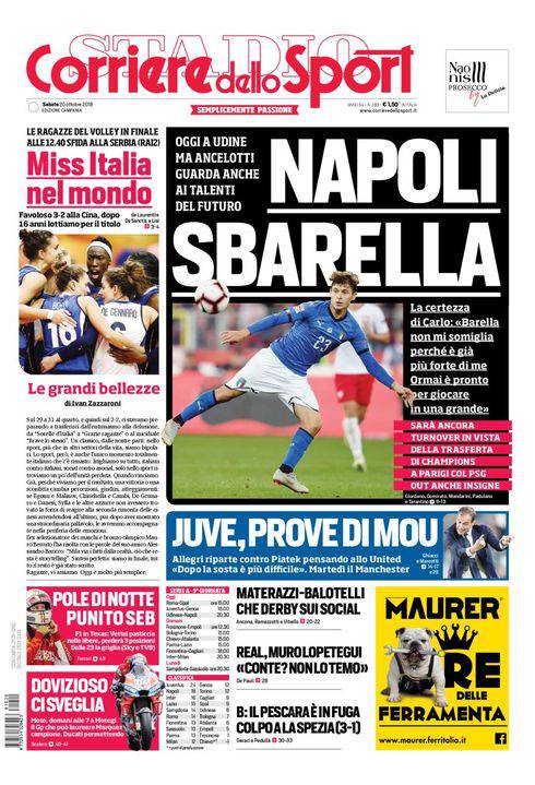 CORRIERE DELLO SPORT – Il quotidiano romano nella sua edizione campana pone Nicolò Barella ed il Napoli all’attenzione di tutti. L’accostamento del giovane e forte centrocampista del Cagliari agli azzurri è avvenuto grazie alle parole di Carlo Ancelotti. “Non mi ricorda me, semplicemente perché lui è più forte dell’Ancelotti da giovane”. In realtà già da diverso tempo Barella circolava nell’ambito del calciomercato del Napoli. Intanto questa sera si scende in campo ad Udine, al ritorno dalla sosta per le nazionali. E l’imperativo è vincere, per affrontare nel migliore dei modi il Paris Saint-Germain in Champions League mercoledì e la Roma in campionato sabato prossimo, sempre di sera. Spazio anche all’Italia femminile di pallavolo, che conquista l’accesso alla finale dei Mondiali. Le azzurre trascinate da Paola Egonu sfideranno la Serbia. Diretta tv alle 12:40 su Rai 2. Chiudono la prima pagina altre notizie di calcio e vari sport.