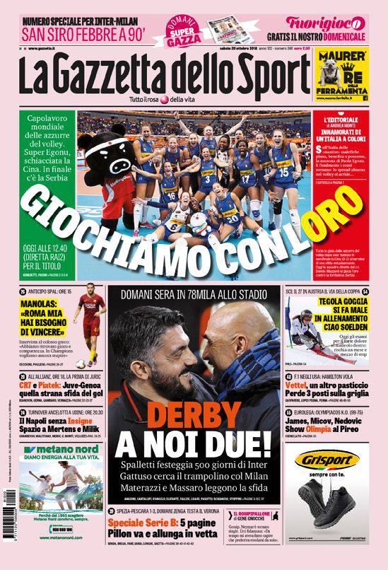 GAZZETTA DELLO SPORT – Sul giornale milanese lo spazio principale è per l’Ital-volley femminile in finale ai Mondiali e per il derby di Milano che si giocherà domani sera. Vengono riportate anche notizie di Roma, Juventus e Napoli. Gli azzurri giocano in serata in casa dell’Udinese, senza Lorenzo Insigne. Chiudono altre notizie di calcio e vari sport.