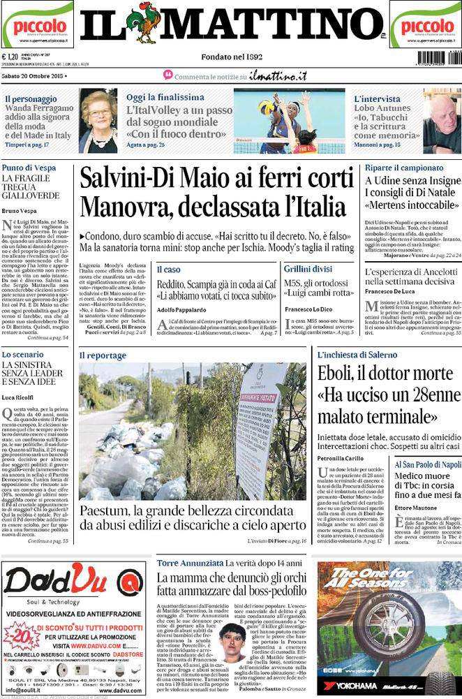 IL MATTINO – Il quotidiano di Napoli riporta diversi aggiornamenti di politica e di cronaca soprattutto italiane. Per lo sport, anche qui largo all’Italia femminile di pallavolo e poi al Napoli. C’è una intervista di Antonio Di Natale, napoletano ed a lungo simbolo dell’Udinese: “Mertens deve giocare sempre”.