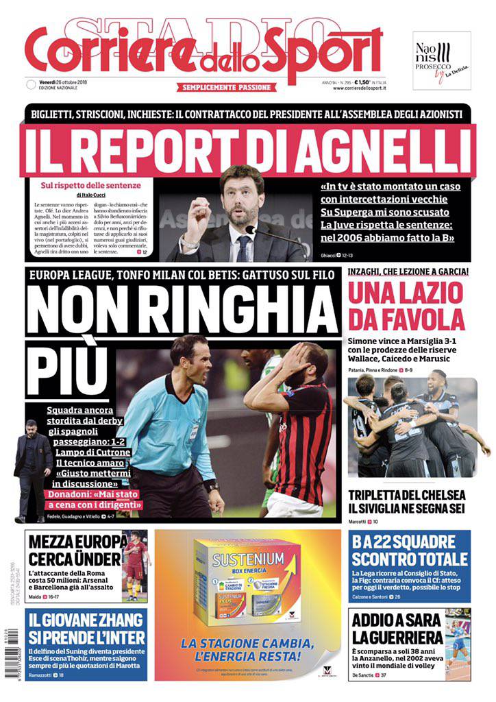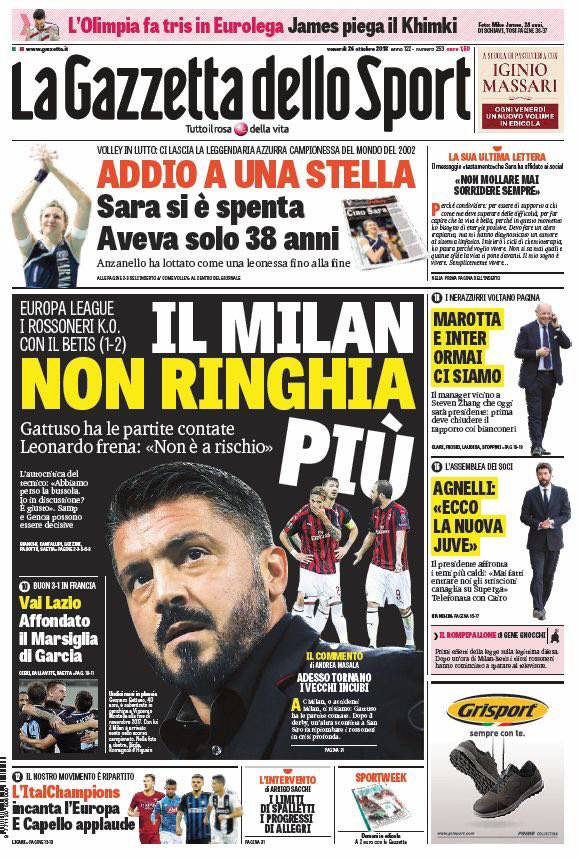 CORRIERE DELLO SPORT – La prima pagina dell’edizione odierna del quotidiano romano parla della deludente prestazione del Milan sconfitto in casa in Europa League dal Betis Siviglia: “Non ringhia più. Tonfo Milan col Betis: Gattuso sul filo. Squadra ancora stordita dal derby. Gli spagnoli passeggiano: 1-2. Lampo di Cutrone. Il tecnico amaro: ‘Giusto mettermi in discussione’. Il Napoli scenderà in campo domenica sera nel posticipo serale della decima giornata di Serie A contro la Roma.