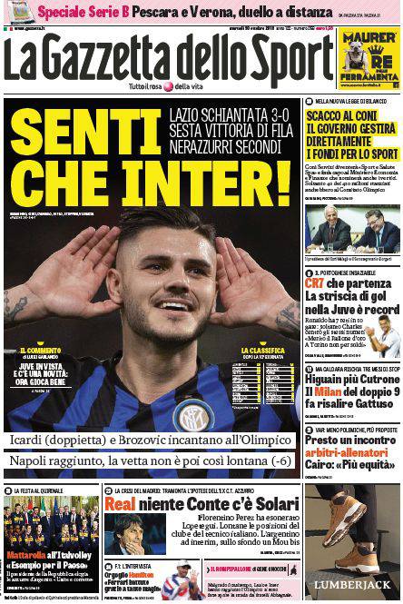 GAZZETTA DELLO SPORT – Anche la prima pagina del quotidiano rosa elogia la prestazione dei nerazzurri a Roma: “Lazio schiantata 3-0. Sesta vittoria di fila dei nerazzurri secondi”.