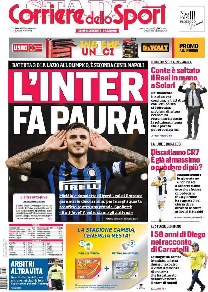 CORRIERE DELLO SPORT – L’edizione odierna del quotidiano romano esalta la vittoria dell’Inter contro la Lazio: “L’Inter fa paura. Battuta 3-0 la Lazio all’Olimpico, è seconda con il Napoli. Micidiale doppietta di Icardi, gol di Brozovic. Gara mai messa in discussione, per Inzaghi quarta sconfitta contro una grande. Spalletti: ‘Anti-Juve? A volte siamo gli anti-noi'”. “Il Corriere dello Sport”, poi, dedica un approfondimento al 58esimo compleanno di Diego Armando Maradona: “I 58 anni di Diego Armando Maradona. Le magie sul campo, le cadute, la lotta durissima contro il vizio. Il romanzo di un uomo che ha catturato definitivamente il cuore di Napoli”.