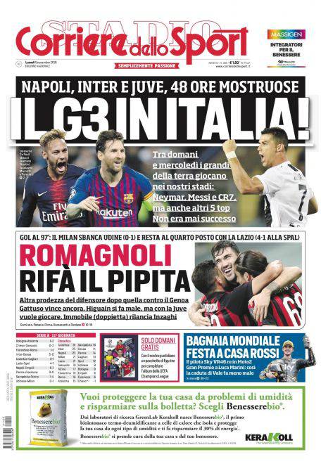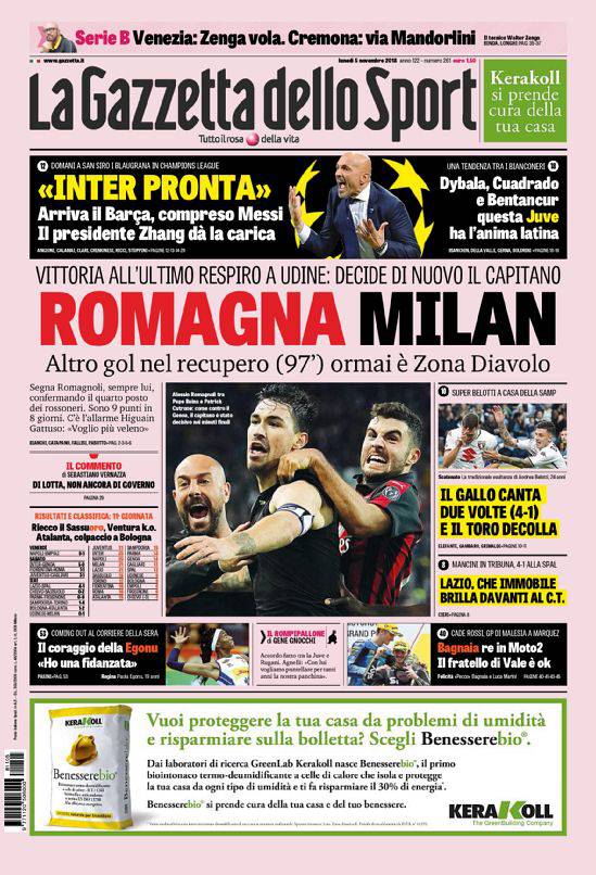 Rassegna stampa sportiva di lunedì 5 novembre 2018, le prime pagine di oggi.